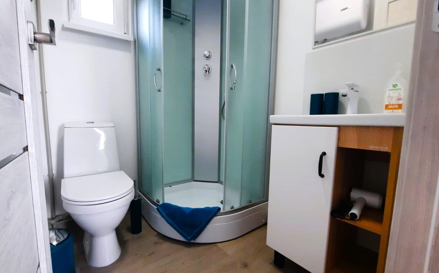 - Санузел: с душевой кабиной, тапочки, туалетные принадлежности, фен
