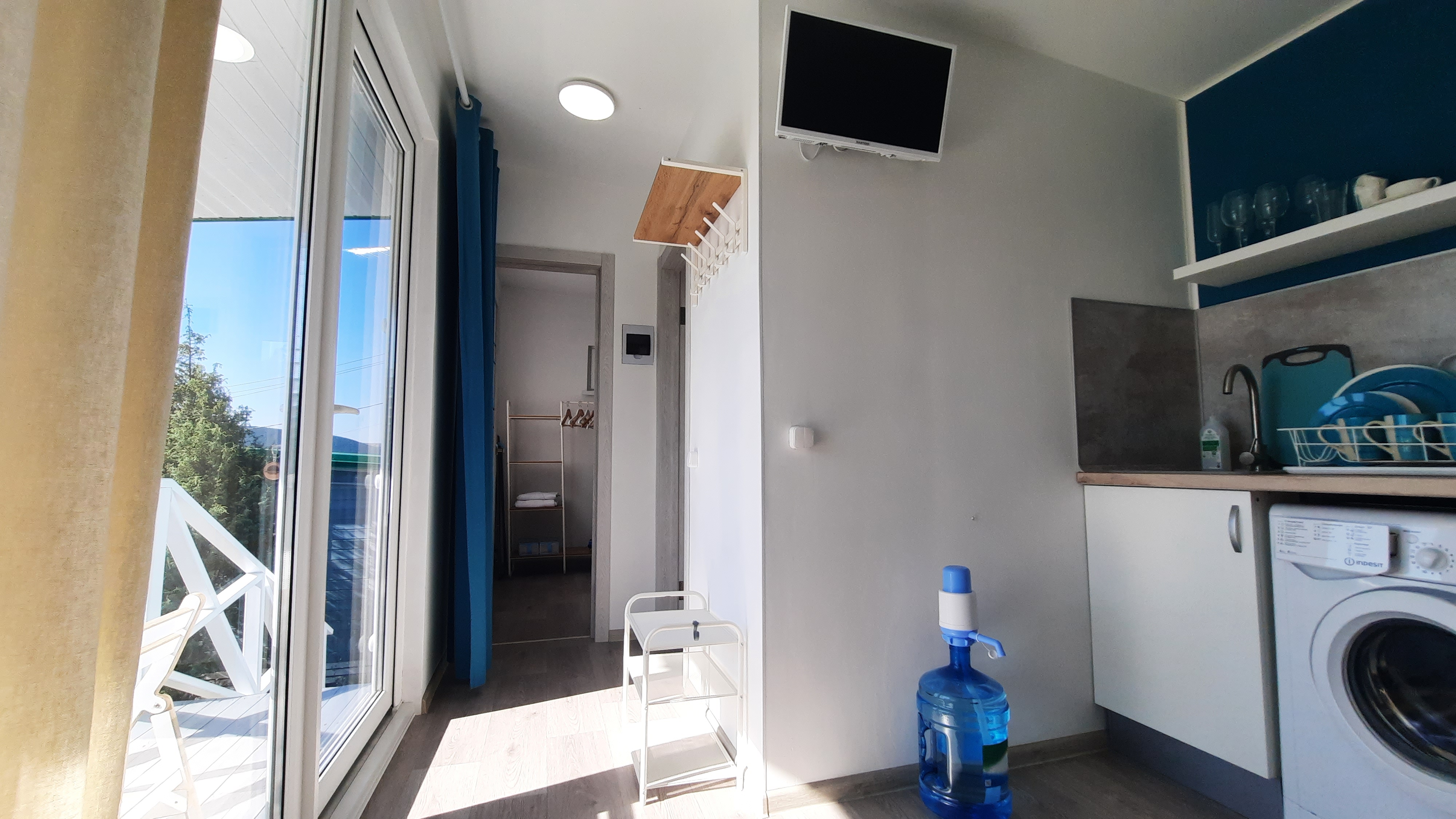 - Оборудование: кондиционер, кулер, микроволновая печь, набор посуды, плита электрическая, пляжные полотенца, стиральная машина, телевизор, утюг, холодильник, электрочайник